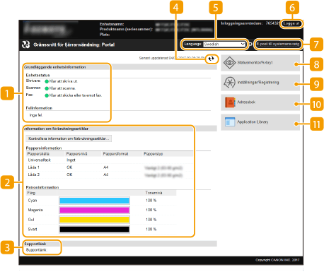 När du loggar in till fjärranvändargränssnittet öppnas följande portalsida. Det här avsnittet beskriver objekten som visas på portalsidan samt grundläggande funktioner.