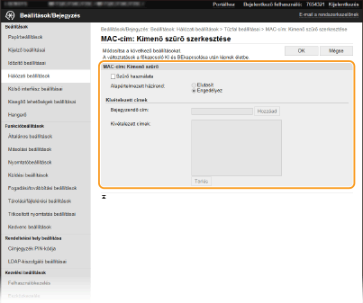 Ha helytelen MAC-címeket ad meg, előfordulhat, hogy nem fog tudni hozzáférni a készülékhez a Távoli felhasználói felületről. Ebben az esetben a <MAC-cím szűrő> beállítást a <Ki> értékre kell állítani. <MAC-cím szűrő>