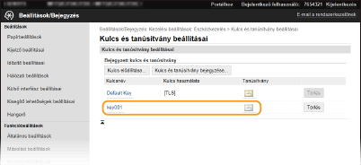 Ha a kulcsot és a tanúsítványt valamelyik funkció használja, ha például a „[TLS]” vagy az „[IEEE 802.1X]” felirat látható a [Kulcs használata] mezőben, a kulcs és a tanúsítvány nem törölhető. Ebben az esetben a kulcs törlése előtt ki kell kapcsolni a funkciót, vagy le kell cserélni a kulcsot és a tanúsítványt.