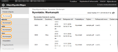 Megjelennek a nyomtatási, másolási, küldési és fogadási feladatok naplói.