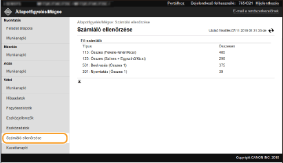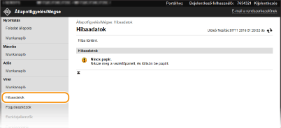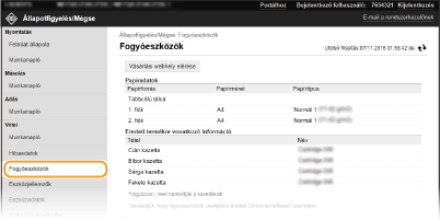 Megjelenik a papírforráshoz tartozó papírtípus és papírméret, valamint a festékkazetta típusszáma stb. A Portál oldalon (főoldalon) található [Fogyóeszköz-adatok ellenőrzése] gombra kattintva is megjelenítheti ezt az oldalt (
