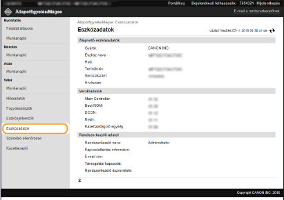 A készülékkel és a rendszerkezelővel kapcsolatos információk jelennek meg. Az itt megjelenő eszköznév, illetve a többi rendszerkezelői információ a [Felhasználókezelés] lap [Rendszerkezelő adatai] beállításában, vagy az [Eszközkezelés] lap [Eszközinformációs beállítások] beállításában megadott értékeknek felel meg.