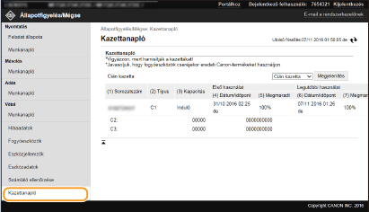 Itt megtekintheti a festékkazetta-naplókat, valamint a többi típusú naplót. Azt is beállíthatja, hogy a festékkazetta melyik színére vonatkozóan jelenjenek meg az adatok.