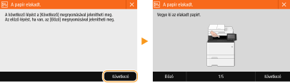 Amikor hiba lép fel, bizonyos esetekben a hiba elhárítására vonatkozó útmutatás jelenik meg a kijelzőn. A probléma megoldásához kövesse a kijelzőn látható utasításokat. Az alábbi ábrán például a papírelakadáskor megjelenő képernyő látható.