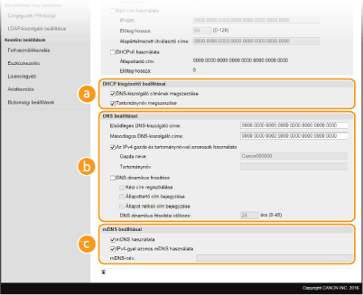 Ha bejelöli a jelölőnégyzetet, akkor a készülék dinamikusan frissíti a DNS-rekordokat, amikor megváltozik az IP-címe. A [Kézi cím regisztrálása], [Állapottartó cím bejegyzése] és [Állapot nélküli cím bejegyzése] jelölőnégyzetek közül a megfelelők bejelölésével adja meg a DNS-kiszolgálón bejegyezni kívánt címtípusokat. A frissítések időközének megadásához írjon be egy időtartamot órákban a [DNS dinamikus frissítési időköze] szövegmezőbe. [mDNS beállításai][mDNS használata]