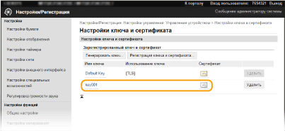Ключ и сертификат невозможно удалить, если они в настоящее время используются в каких-либо целях, например, если в разделе [Использование ключа] отображается «[TLS]» или «[IEEE 802.1X]». В этом случае отключите функцию или замените ключ и сертификат перед их удалением.