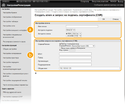 Если выбрано значение [SHA384] или [SHA512] в пункте [Алгоритм подписи], невозможно выбрать значение [512 бит] в качестве длины ключа, если выбрано значение [RSA] в поле [Алгоритм ключа].