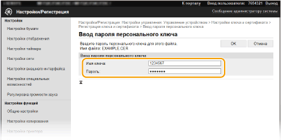[Пароль] Введите алфавитно-цифровые символы для пароля закрытого ключа, заданного для регистрируемого файла.