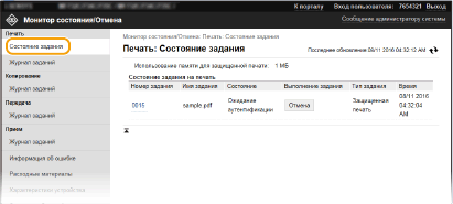 Нажмите [Номер задания] на документах, печать которых была приостановлена, или для которых используется безопасная печать, чтобы просмотреть подробную информацию. Можно просмотреть имя пользователя и количество страниц печатаемого документа.