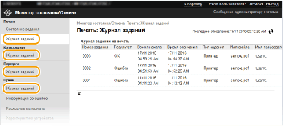 Отображаются журналы заданий печати, копирования, отправки (TX) и приема (RX).