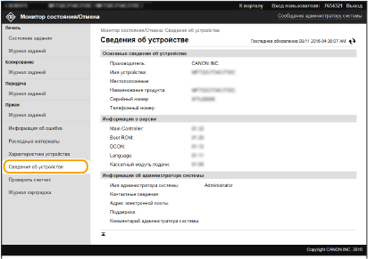 Отображение сведений об аппарате и администраторе системы. Здесь отображаются имя устройства и другие сведения для администратора системы в соответствии с настройками в пункте [Информация об администраторе системы] на странице [Управление пользователями] или в [Настройки сведений об устройстве] на странице [Управление устройством].