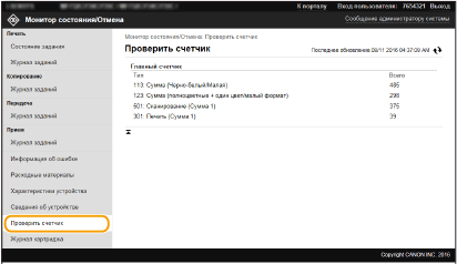 Отображается общее число страниц, напечатанных с использованием функций печати, копирования и факса.