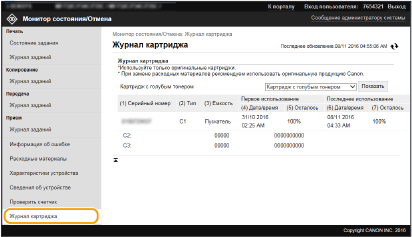 Можно проверить журналы картриджей с тонером и другие журналы. Индикацию можно изменить для картриджей с тонером каждого цвета.