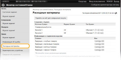 Отображение формата и типа бумаги для источника бумаги, номера модели картриджа с тонером и других сведений. Для отображения этой страницы можно также нажать кнопку [Проверить сведения о расходных материалах] на странице портала (главной странице) (