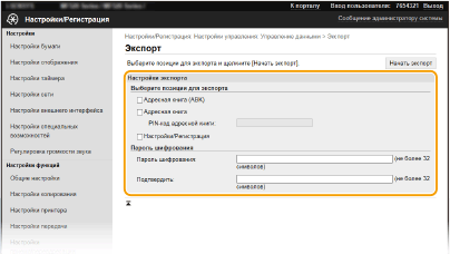 Введите пароль для шифрования экспортируемых данных, используя алфавитно-цифровые символы. Введите этот же пароль в поле [Подтвердить]. Если установлен флажок [Адресная книга] или [Настройки/Регистрация], экспорт данных без установленного пароля шифрования невозможен.