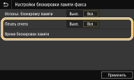 Чтобы сохранить полученные документы в памяти, установите для параметра <Использ. блокировку памяти> значение <Вкл.>. Можно также указать дополнительные настройки, например настройку времени, указывающую период в течение дня, когда принятые документы сохраняются в память.