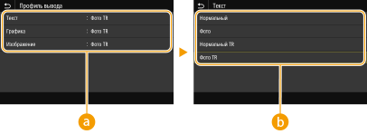 Настройка параметра таким образом, чтобы черный текст, для которого в цветовой информации задано «R = G = B = 0%», «C = M = Y = 100%» или «C = M = Y = 0%/K = 100%», печатался с использованием только тонера K (черный). Если выбрано значение <Выключить>, текст печатается на основе параметра <Профиль вывода>.