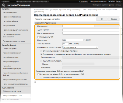 Если в сети есть сервер LDAP, можно найти на сервере номера факсов и адреса электронной почты, а затем задать их в качестве мест назначения или зарегистрировать их в адресной книге. Обратите внимание, что в случае включения аутентификации функции отправки ( Аутентификация сервера LDAP) вам необходимо зарегистрировать сервер, используемый для аутентификации. Можно зарегистрировать не более пяти серверов LDAP для поиска и аутентификации аппарата. Зарегистрируйте серверы LDAP с помощью Удаленного ИП.