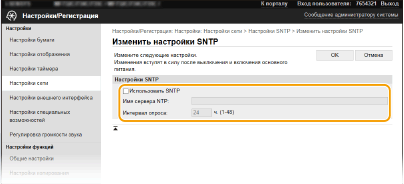 Проверка связи с сервером NTP/SNTPМожно просмотреть состояние связи с зарегистрированным сервером, нажав [Настройки/Регистрация]