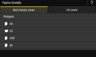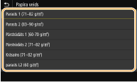 Ja iepriekš redzamais ekrāns netiek rādīts, ievietojot papīruJa universālajā teknē vienmēr ievietojat vienu un to pašu papīra formātu, varat izlaist papīra iestatīšanas darbības, reģistrējot papīra formātu un veidu kā noklusējuma iestatījumu. Reģistrējot noklusējuma iestatījumu, iepriekš redzamais ekrāns netiek parādīts. Lai parādītu ekrānu, izvēlieties <Norādīt, ievietojot papīru> (Noklusējuma papīra iestatījumu reģistrēšana daudzfunkciju papīrturim).