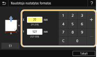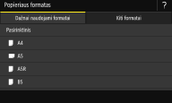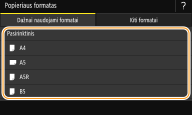 ![]() ![]() Jeigu užregistruojate dažnai naudojamo popieriaus formatą naudodami mygtukus <S1>–<S3>, galite iškviesti juos vienu lietimu. Pasirinktinio popieriaus formato registravimas