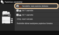 Jei numatytieji popieriaus parametrai įregistruoti, įdėjus popieriaus, parametrų ekranas nerodomas ir visada naudojami tie patys parametrai. Jei įdedate kitokio formato arba tipo popierių ir nepakeičiate parametrų, aparatas gali spausdinti netinkamai. Norėdami išvengti šios problemos, atlikdami 3 veiksmą pasirinkite <Nurodykite, kada popierius įdedamas>, tada įdėkite popierių.