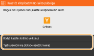 Jei aparatui priimant faksogramą arba esant nustatytai automatinei ataskaitų išvesčiai rodomas pranešimas apie juodos spalvos dažomuosius miltelius, gautos faksogramos ir ataskaitos bus išsaugomos atmintyje, kad išspausdinus neatrodytų išblukusios. Jei norite toliau spausdinti, net jei liko mažas kiekis dažomųjų miltelių, <Tęsti spausd. kai maž. rašalo> nustatykite kaip <Įjungta>. <Tęsti spausd. kai maž. rašalo>