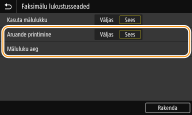 Vastuvõetud dokumentide mällu salvestamiseks määrake säte <Kasuta mälulukku> olekusse <Sees>. Samuti võite määrata valikulisi seadeid (nt ajaseade, mis määrab päeval ajavahemiku, millal vastuvõetud dokumendid talletatakse mällu).