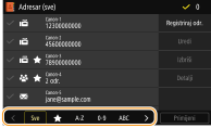 Često korištena odredišta faksiranja i skeniranja možete registrirati u adresaru i tako ih jednostavno odabrati prema potrebi (Registriranje odredišta u adresaru). Odredišta se mogu pretraživati po abecedi, s popisa u adresaru ili unosom troznamenkastog broja (brojevi za kodirano biranje). Pomoću sljedećih značajki možete brže odrediti odredišta.