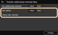 Da biste primljene dokumente pohranili u memoriju, <Kor. zaključavanje memorije> postavite na <Uključ.>. Možete definirati i dodatne postavke, npr.vremensku postavku koja definira razdoblje tijekom dana kada se primljeni dokumenti pohranjuju u memoriju.
