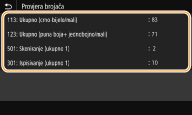 Možete zasebno provjeriti ukupan broj stranica za ispise u boji i crno-bijele ispise. Osim kopija i ispisa podataka s računala, ti ukupni iznosi obuhvaćaju faksove, izvješća i popise.