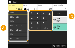 Копії можна збільшувати або зменшувати за допомогою попередньо встановленого коефіцієнта масштабування, наприклад <A5->A4>, або встановивши користувацький коефіцієнт масштабування з кроком 1%.