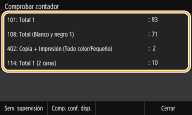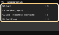 Puede consultar por separado los totales del número de páginas utilizadas para las impresiones en color y las impresiones en blanco y negro. Estos totales incluyen faxes, informes y listas, además de copias e impresiones de datos desde ordenadores.