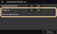 Để in các tài liệu đã nhận trong bộ nhớ, cài đặt <Sử Dụng Khóa Bộ Nhớ> thành <Tắt>. Tất cả các tài liệu trong bộ nhớ đều được in.