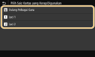 Saiz kertas yang tidak dipilih boleh dilihat dengan memilih tab <Saiz Lain> dalam skrin pemilihan tetapan saiz kertas.