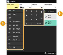 Anda boleh membesarkan atau mengurangkan salinan menggunakan nisbah salinan praset seperti <A5->A4/LTR> atau dengan menetapkan nisbah salinan tersuai dalam kenaikan 1%.