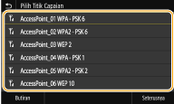 Anda boleh mencari penghala wayarles (atau titik akses) yang tersedia untuk sambungan dan pilih satu daripada paparan mesin. Untuk kunci rangkaian, masukkan kunci WEP atau PSK. Sebelum memilih penghala wayarles, semak dan catatkan maklumat penyediaan yang diperlukan, termasuk SSID dan kekunci rangkaian (