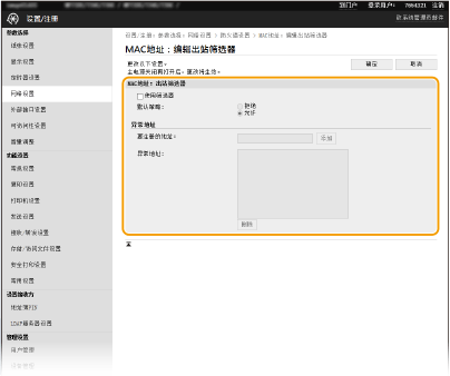 如果错误输入 MAC 地址,则可能无法从远程用户界面访问本机,此时需要将 <MAC地址筛选器> 设置为 <关闭>。 <MAC地址筛选器>