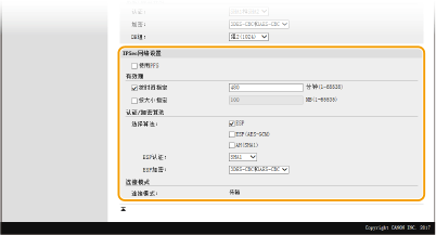 若要启用 ESP 认证,请对哈希算法选择 [SHA1]。如果想要禁用 ESP 认证,请选择 [不使用]。