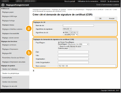 Comme les certificats générés sur l'appareil ne portent pas de signature CA, une erreur de communication peut se produire avec certains périphériques avec lesquels l'appareil communique. Pour qu'une autorité de certification émette le certificat avec une signature CA, vous devez obtenir les données de demande de signature de certificat (CSR), que l'administrateur peut générer depuis l'interface utilisateur distante. Une fois le certificat émis, enregistrez-le sur la clé générée avec la demande CSR.