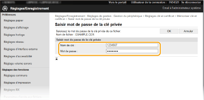 Saisissez le mot de passe de la clé privée définie pour le fichier à enregistrer en caractères alphanumériques.