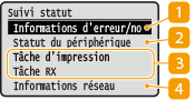 Lorsque vous appuyez sur <Suivi statut> (), un écran s'affiche dans lequel vous pouvez consulter la progression du traitement des documents, l'état de l'appareil (quantité de toner restant dans les cartouches de toner, etc.) et les réglages réseau comme l'adresse IP de l'appareil.
