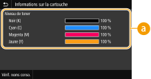 Affiche la quantité d'encre restante dans les cartouches de toner. D'autres pièces internes peuvent atteindre leur fin de vie avant l'épuisement du toner.