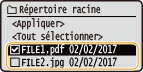Si les types de fichier sont mélangés, sélectionnez <Fichiers JPEG/TIFF> ou <Fichiers PDF>.