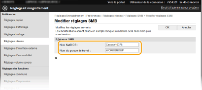 Le protocole SMB (Server Message Block) est un protocole consistant à partager les ressources comme des fichiers et des imprimantes avec plusieurs périphériques d'un réseau. Vous devez l'utiliser pour configurer l'appareil en tant qu'imprimante partagée sur un réseau SMB. Selon le réseau utilisé, vous devrez peut-être définir le nom NetBIOS et le nom du groupe de travail.