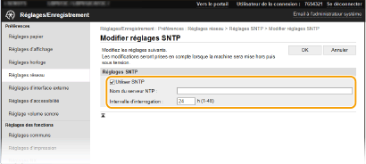 Test des communications avec le serveur NTP/SNTPVous pouvez afficher l'état des communications avec le serveur enregistré en cliquant sur [Réglages/Enregistrement]