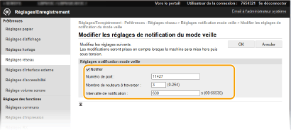 Cochez la case pour définir l'appareil de sorte qu'il réponde aux paquets de découverte de multidiffusion et permette la surveillance par le logiciel de gestion des périphériques. ![]() Pour modifier le numéro de port de découverte multidiffusion, reportez-vous à la section Modification des numéros de port.