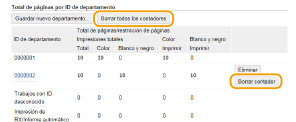 Si desea poner a cero todos los recuentos, haga clic en el vínculo de texto correspondiente situado debajo de [ID de departamento] y haga clic en [Borrar contador] /b_key_arrow_right.gif) [Aceptar]. Si desea poner a cero los recuentos de todos los ID de departamento, haga clic en [Borrar todos los contadores] /b_key_arrow_right.gif) [Aceptar].
