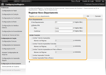 Registre uma ID de Departamento e defina um PIN para ela. Registre todas as IDs de departamento a serem utilizadas.