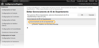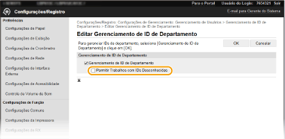 Definindo a Gerenciamento de IDs do departamento para a impressão do computador). Contudo, se a caixa de seleção for selecionada para essa configuração, os trabalhos são executados mesmo quando a ID e o PIN não são inseridos. Para configurar de modo que os trabalhos não sejam executados a menos que a ID e PIN de departamento corretos sejam inseridos, desmarque a caixa de seleção.